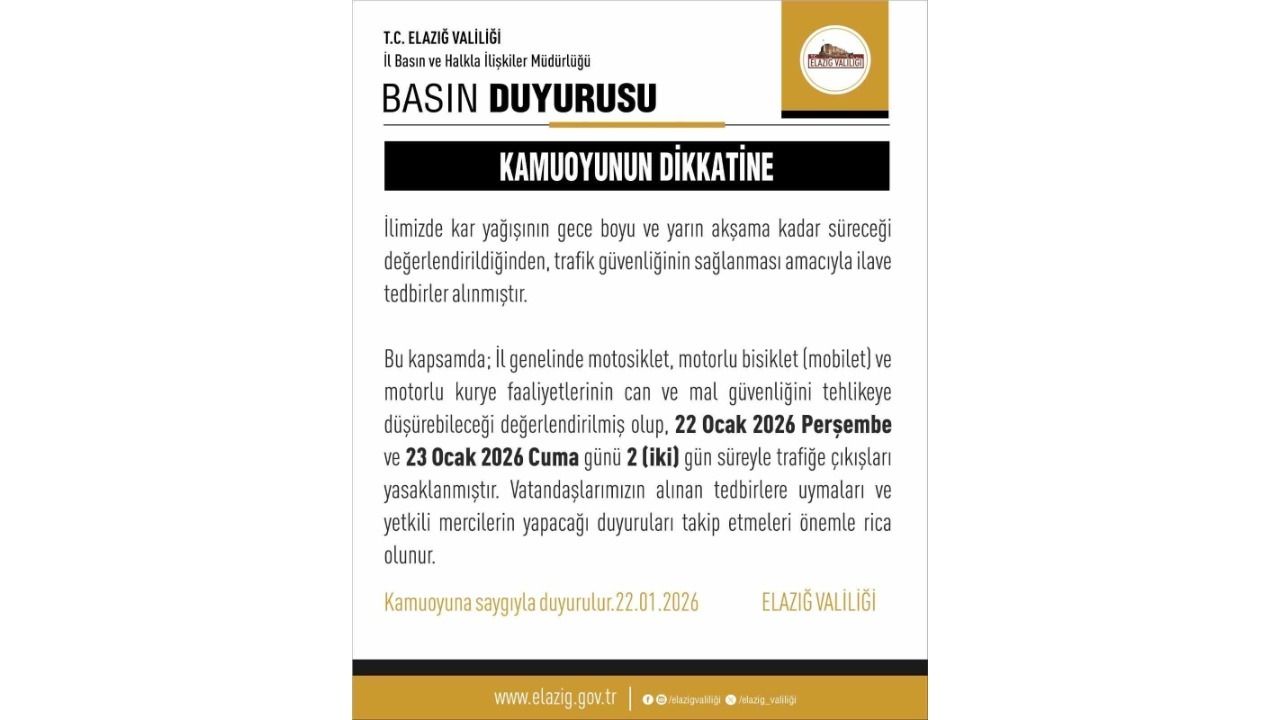 Elazığ Valiliği'nden yapılan açıklamada, 'İlimizde kar yağışının gece boyu ve yarın akşama kadar süreceği değerlendirildiğinden, trafik güvenliğinin sağlanması amacıyla ilave tedbirler alınmıştır. Bu kapsamda; İl genelinde motosiklet, motorlu bisiklet (mobilet) ve motorlu kurye faaliyetlerinin can ve mal güvenliğini tehlikeye düşürebileceği değerlendirilmiş olup, 22 Ocak 2026 Perşembe ve 23 Ocak 2026 Cuma günü 2 (iki) gün süreyle trafiğe çıkışları yasaklanmıştır. Vatandaşlarımızın alınan tedbirlere uymaları ve yetkili mercilerin yapacağı duyuruları takip etmeleri önemle rica olunur' denildi.