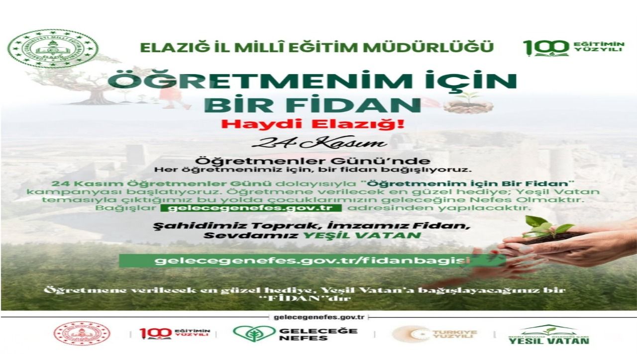 Kampanyada her bir fidan, bir öğretmene adanacak. İl Milli Eğitim Müdürlüğü, 24 Kasım Öğretmenler Günü’nde öğretmenler adına dikilecek her fidanın “geleceğe bırakılacak yeşil bir miras” olacağını vurguladı.