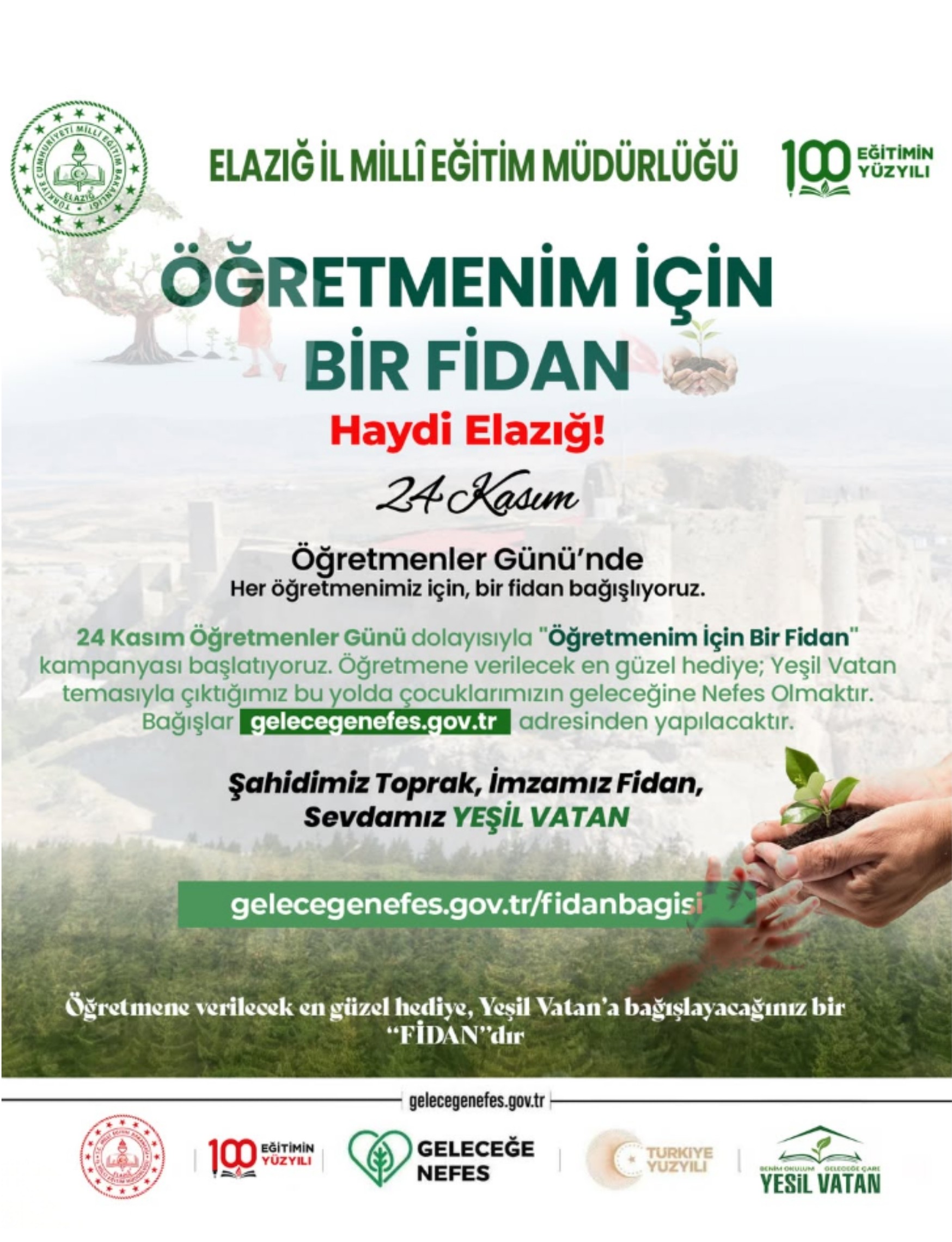 Cumhuriyetin kurucusu Gazi Mustafa Kemal Atatürk’ün gösterdiği yolda, çevreye duyarlı bireyler yetiştirme anlayışıyla hazırlanan proje kapsamında öğretmenler, öğrenciler ve veliler, fidan sahiplenmeye davet edildi. İl Milli Eğitim Müdürlüğü yetkilileri, “doğayı korumanın vatanı korumak olduğu” bilinciyle hareket ettiklerini belirterek, Elazığ genelinde tüm okullarda fidan dikim etkinliklerinin yapılacağını duyurdu.