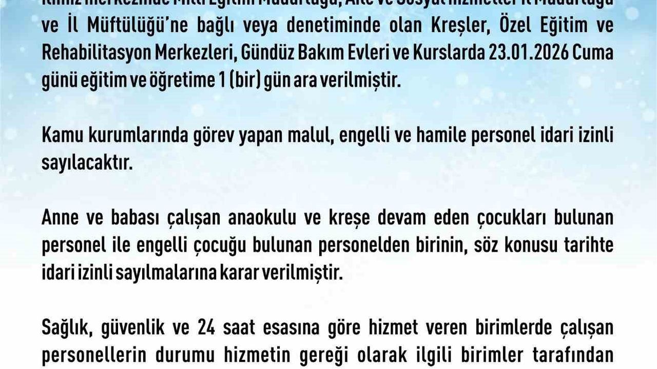 Elazığ Valiliği'nden yapılan açıklamada, 'Kar yağışının gece boyu ve yarın akşama kadar süreceği değerlendirildiğinden ilimiz merkezinde Milli Eğitim Müdürlüğü, Aile ve Sosyal hizmetler İl Müdürlüğü ve İl Müftülüğü'ne bağlı veya denetiminde olan kreşler, özel eğitim ve rehabilitasyon merkezleri, gündüz bakım evleri ve kurslarda Cuma günü eğitim ve öğretime 1 (bir) gün ara verilmiştir. Kamu kurumlarında görev yapan malul, engelli ve hamile personel idari izinli sayılacaktır. Anne ve babası çalışan anaokulu ve kreşe devam eden çocukları bulunan personel ile engelli çocuğu bulunan personelden birinin, söz konusu tarihte idari izinli sayılmalarına karar verilmiştir. Sağlık, güvenlik ve 24 saat esasına göre hizmet veren birimlerde çalışan personellerin durumu hizmetin gereği olarak ilgili birimler tarafından değerlendirilecektir. İlçelerde ise Kaymakamlar tarafından karar verilecektir' denildi.