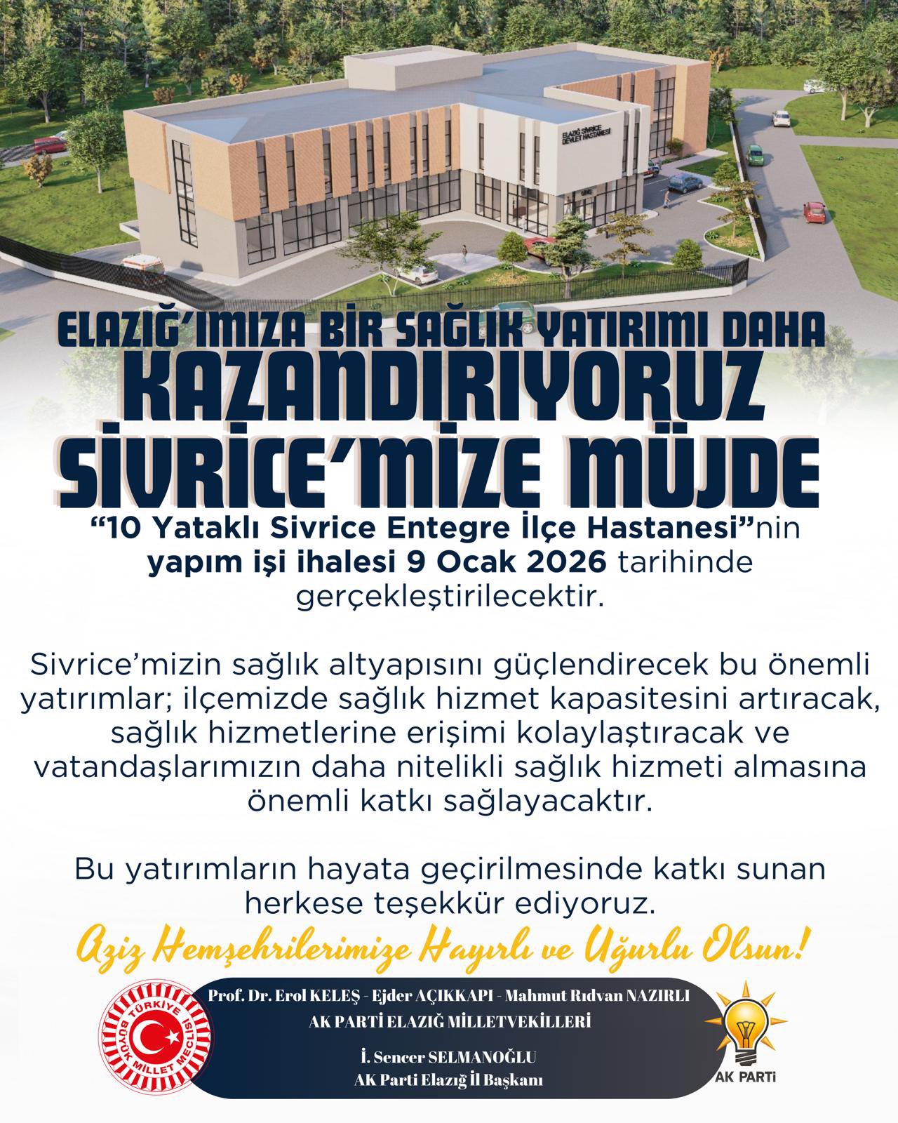 Elazığ’da sağlık yatırımları artarak devam ediyor. Uzun süredir Sivrice ilçesinde hayata geçirilmesi beklenen 10 yataklı entegre ilçe hastanesi projesinde somut bir aşamaya geçildi. AK Parti Elazığ Milletvekili Ejder Açıkkapı tarafından kamuoyuna duyurulan proje kapsamında, Sivrice Entegre İlçe Hastanesi’nin yapım işi ihalesinin 9 Ocak 2026 tarihinde gerçekleştirileceği bildirildi.
