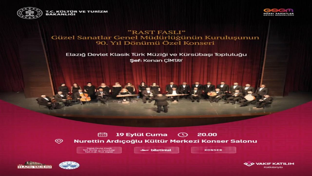 Elazığ’da sanatseverler, yeni sezonun ilk konserinde Klasik Türk Müziği’nin seçkin eserleriyle buluşacak. Elazığ Devlet Klasik Türk Müziği ve Kürsübaşı Topluluğu, Güzel Sanatlar Genel Müdürlüğü’nün 90. kuruluş yıldönümü etkinlikleri kapsamında 19 Eylül Cuma günü saat 20.00’de Rast Faslı Konseri düzenleyecek.