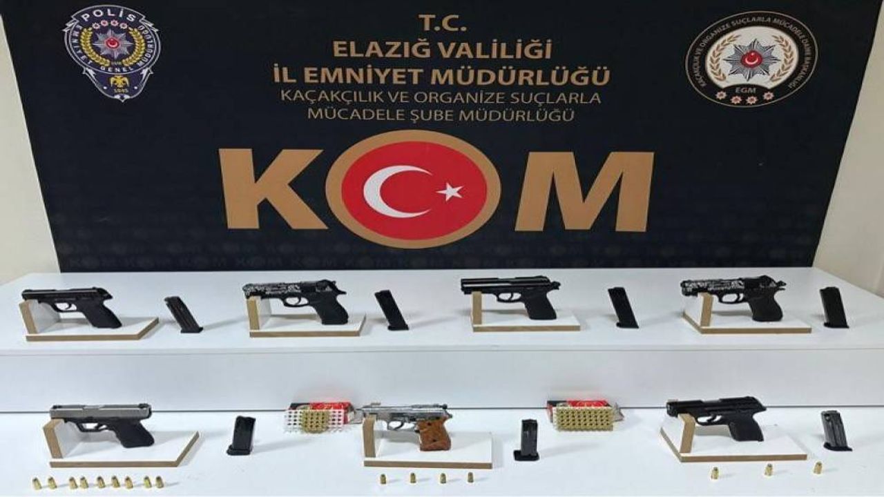 Elazığ Cumhuriyet Başsavcılığı koordinesinde İl Emniyet Müdürlüğü Kaçakçılık ve Organize Suçlarla Mücadele Şube Müdürlüğü ekipleri, piyasaya sürülmek üzere Elazığ’a çok sayıda ruhsatsız silah getirileceği bilgisine ulaştı. Bunun üzerine ekipler tarafından yapılan operasyonda, 7 adet ruhsatsız tabanca ve tabancalara ait 90 adet fişek ele geçirilirken 1 şüpheli ise ‘Silah Ticareti Yapmak’ suçundan yakalanarak gözaltına alındı.