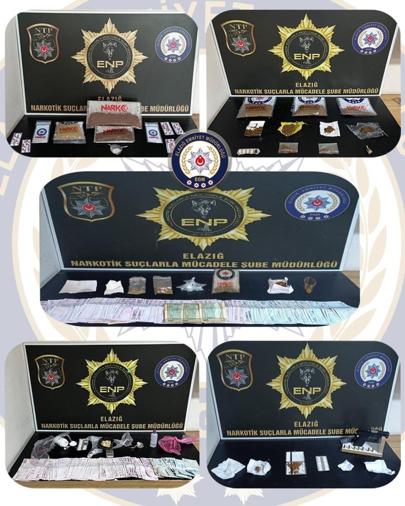 Elazığ Cumhuriyet Başsavcılığı koordinesinde İl Emniyet Müdürlüğü Narkotik Suçlarla Mücadele Şube Müdürlüğü tarafından uyuşturucu ile mücadele kapsamında uyuşturucu madde kullanan şahıslara ve sokak satıcılarına yönelik yapılan operasyon yapıldı. Operasyonda; 22 parça halinde 602,16 gram sentetik kannabinoid maddesi, 5 parça halinde 5,48 gram metamfetamin maddesi, 2 parça halinde 19.85 gram esrar maddesi, 151 adet sentetik ecza maddesi, 1 adet ruhsatsız tabanca ve tabancaya ait 7 adet fişek, 1 adet hassas terazi, uyuşturucu madde ticaretinden elde edildiği değerlendirilen 64 bin 485 TL ve 130 Dolar ele geçirildi.
