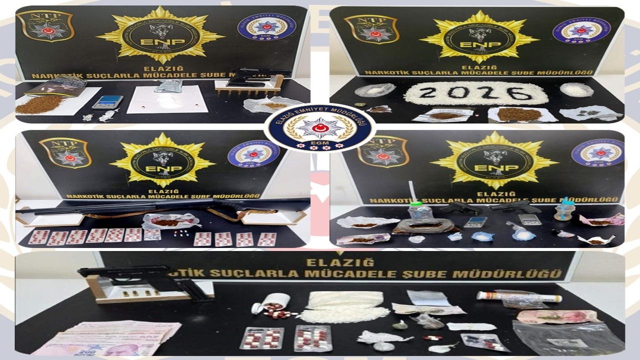 Elazığ Cumhuriyet Başsavcılığı koordinesinde İl Emniyet Müdürlüğü Narkotik Suçlarla Mücadele ve Asayiş Şube Müdürlüklerince uyuşturucu ile mücadele ve ruhsatsız silahların önlenmesine yönelik yılbaşından bu yana yürütülen çalışmalarda önemli miktarda suç unsuru ele geçirildi. Gerçekleştirilen operasyonlarda 27 parça halinde 1 kilo 221 gram metamfetamin, 32 parça halinde 527 gram sentetik kannabinoid, 6 parça halinde 117 gram kokain, 635 adet sentetik ecza, 10 parça halinde 49 gram esrar ile birlikte 3 adet hassas terazi ele geçirildi. Ayrıca operasyonlarda 15 adet ruhsatsız tabanca ve bu tabancalara ait 36 adet fişek ile 6 adet ruhsatsız tüfek ve 8 adet kartuşa el konuldu.