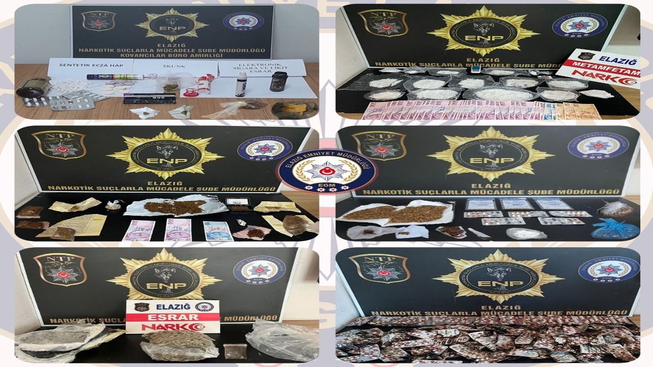 Elazığ Cumhuriyet Başsavcılığı koordinesinde İl Emniyet Müdürlüğü ekipleri tarafından uyuşturucu ile mücadele kapsamında son bir aylık süre içerisinde uyuşturucu madde kullanan şahıslara ve uyuşturucu madde ticareti yapan şahıslara yönelik çalışma yapıldı. Yapılan operasyonlarda; 41 parça halinde 1 kilo 145 gram sentetik kannabinoid maddesi, 8 parça halinde 643,69 gram esrar maddesi, 30 parça halinde 471,65 gram metamfetamin maddesi, 3 bin 146 adet sentetik ecza maddesi, 1 adet ruhsatsız tüfek, 1 adet ruhsatsız tabanca ve tabancaya ait 4 adet fişek, 2 adet hassas terazi ele geçirildi.