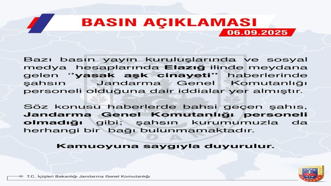 Yapılan açıklamada, olayla ilgili bazı medya kuruluşları ve sosyal medyada yayılan, failin jandarma personeli olduğuna dair iddiaların gerçek dışı olduğu vurgulandı. Jandarma, “Olayla bağlantılı olduğu öne sürülen kişi, Jandarma Genel Komutanlığı’na bağlı değildir ve kurumumuzla hiçbir ilişiği bulunmamaktadır” ifadelerini kullandı.