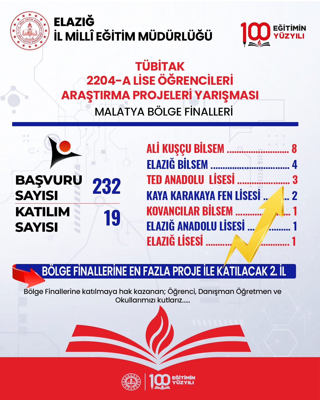 Bu yıl yarışmaya Elazığ’daki liseler tarafından 232 proje başvurusu yapıldı. Değerlendirme süreci sonunda 19 proje, bölge sergisinde sergilenmeye ve finallerde yarışmaya hak kazandı. Elde edilen sonuçla Elazığ, Malatya Bölge Finalleri’ne katılan iller arasında proje sayısı bakımından üst sıralarda yer aldı.