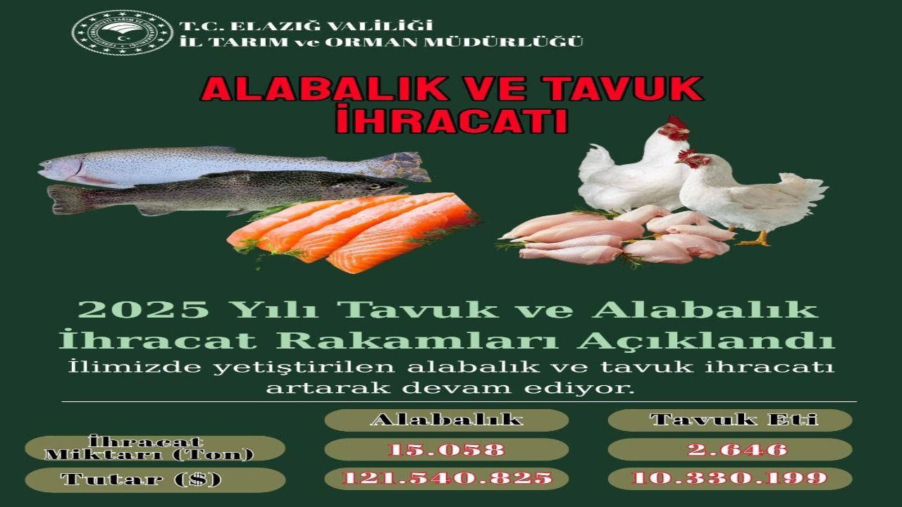 Aynı yıl içerisinde gerçekleştirilen 2 bin 646 ton tavuk eti ihracatıyla ise 10 milyon 330 bin 199 dolar hasıla elde edildi. Veriler, Elazığ’ın su ürünleri ve hayvansal üretimdeki gücünü bir kez daha ortaya koydu.