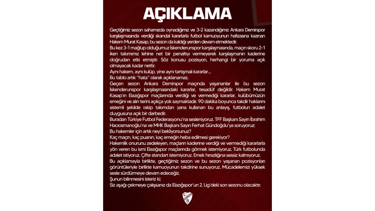 Yönetim Kurulu açıklamasında, İskenderunspor mücadelesinde skor 2-1 iken Elazığspor lehine net bir penaltının verilmediği, bu pozisyonun karşılaşmanın kırılma anı olduğu ifade edildi. Aynı hakemin, aynı kulüp maçlarında tekrar eden tartışmalı kararlar almasının dikkat çekici olduğu belirtilerek, bu durumun tesadüf olarak görülemeyeceği kaydedildi.