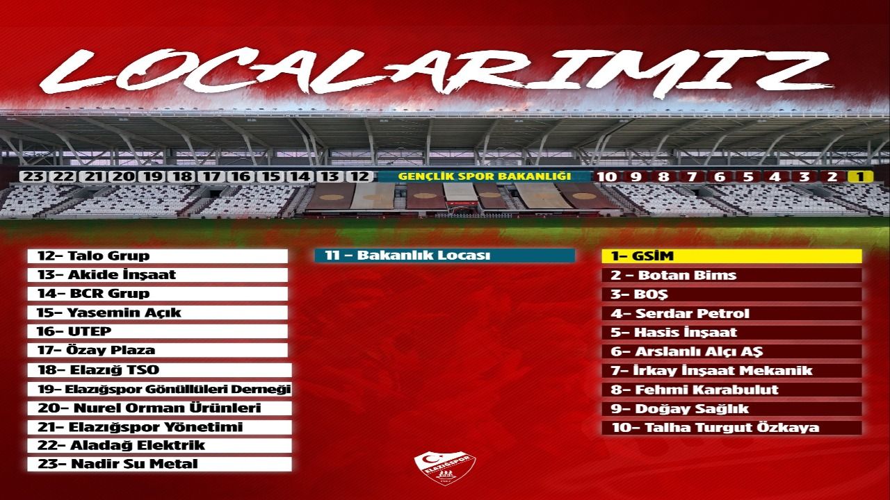 GSİM, Botan Bims, Serdar Petrol, Has İş İnşaat, Arslanlı Alçı A.Ş., İrkay İnşaat Mekanik, Fehmi Karabulut, Doğay Sağlık, Talha Turgut Özkaya, Bakanlık Locası, Talo Grup, Akide İnşaat, BCR Grup, Yasemin Açık, UTEP, Özay Plaza, Elazığ Ticaret ve Sanayi Odası, Elazığspor Gönüllüleri Derneği, Nurel Orman Ürünleri, Elazığspor Yönetimi ve Aladağ Elektrik.