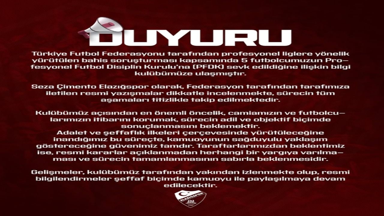 Elazığspor, soruşturmanın adalet ve şeffaflık ilkeleri doğrultusunda yürütüleceğine inandıklarını vurgulayarak taraftarlardan sabır ve sağduyu beklediklerini ifade etti.