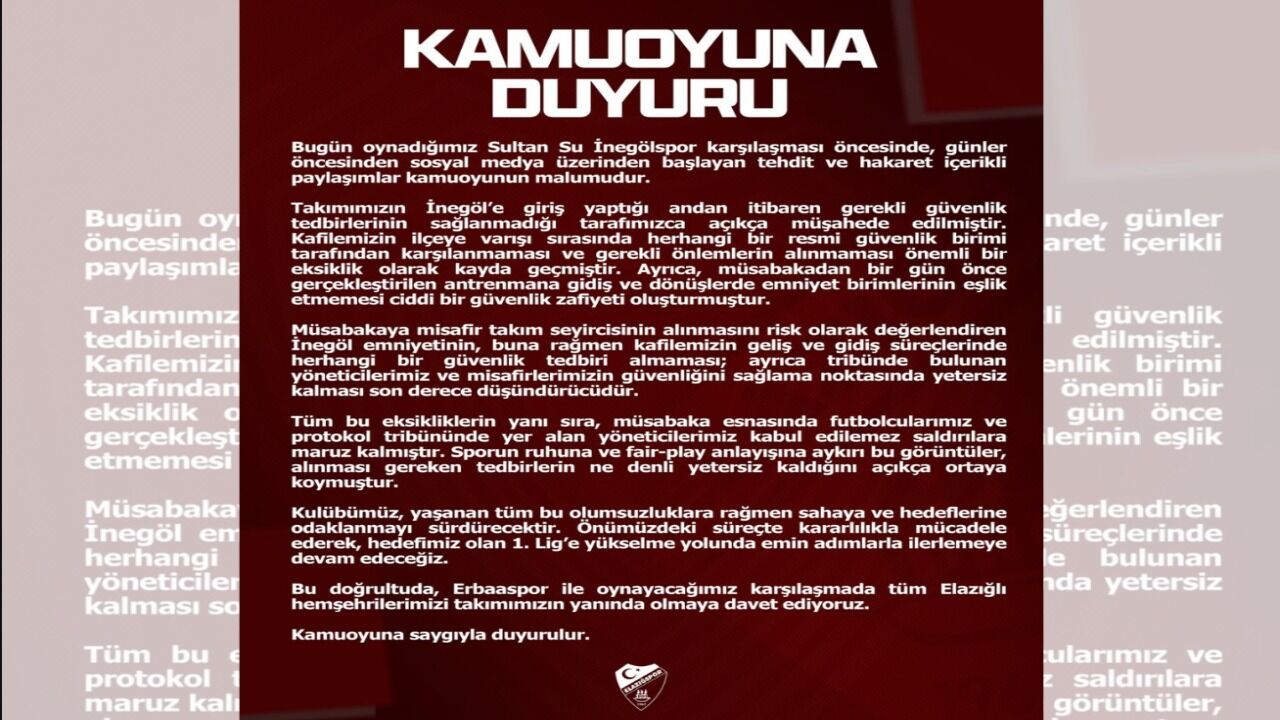 Elazığspor, İnegölspor ile oynanan karşılaşma öncesinde, maç sırasında ve sonrasında yaşanan gelişmelere ilişkin kamuoyunu bilgilendiren bir açıklama yayımladı. Açıklamada, müsabaka öncesinde sosyal medya üzerinden başlayan tehdit ve hakaret içerikli paylaşımların süreci olumsuz etkilediği belirtildi.