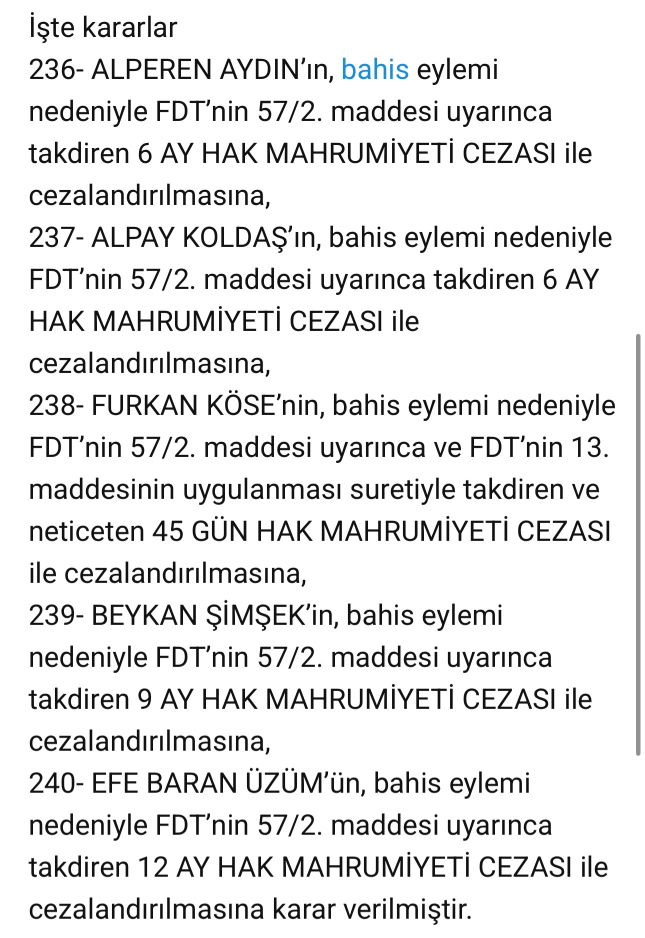 Furkan Köse: 45 gün hak mahrumiyeti (FDT’nin 13. maddesi uyarınca takdiri indirim uygulanarak)