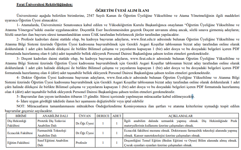 Adaylardan, ilanda belirtilen özel ve genel şartları sağlamaları, gerekli belgeleri eksiksiz şekilde teslim etmeleri istenecek. Başvuruların süresi, detayları ve ilgili fakültelere dair bilgilere Fırat Üniversitesi’nin resmi internet sitesi üzerinden ulaşılabilecek.
