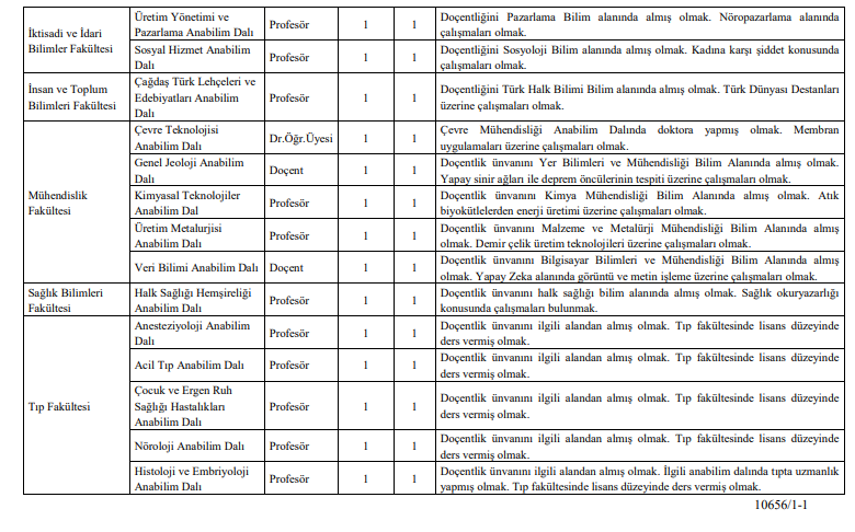Yapılacak alımlar kapsamında 12 profesör, 2 doçent ve 3 doktor öğretim üyesi kadrosu açıldı. Başvurular, 2547 Sayılı Yükseköğretim Kanunu ile Öğretim Üyeliğine Yükseltilme ve Atama Yönetmeliği hükümleri doğrultusunda değerlendirilecek.