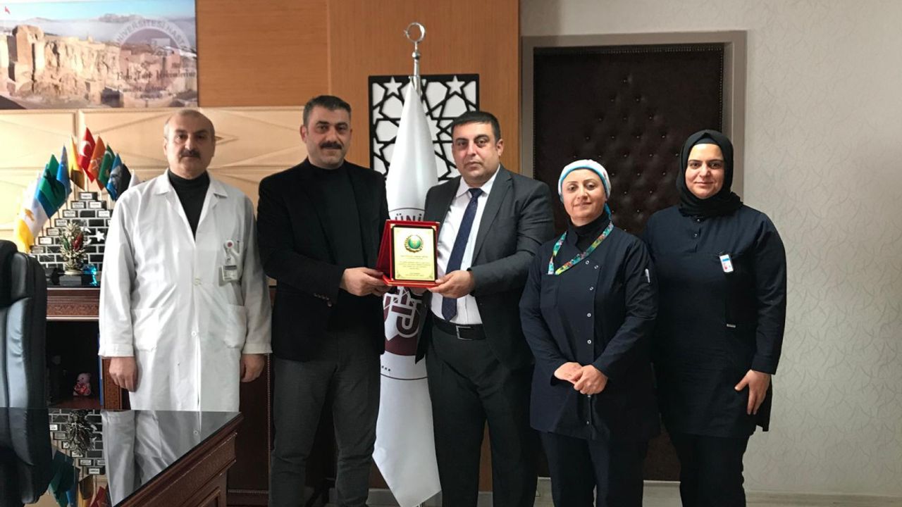 Kamu Sağlık-Sen Genel Başkanı Ümit Karataş, Fırat Üniversitesi Hastanesi Başhekimi Prof. Dr. Gökhan Artaş’a, göreve başladığı günden bu yana sağlık çalışanlarına yönelik gerçekleştirdiği iyileştirmeler nedeniyle teşekkür plaketi takdim etti.