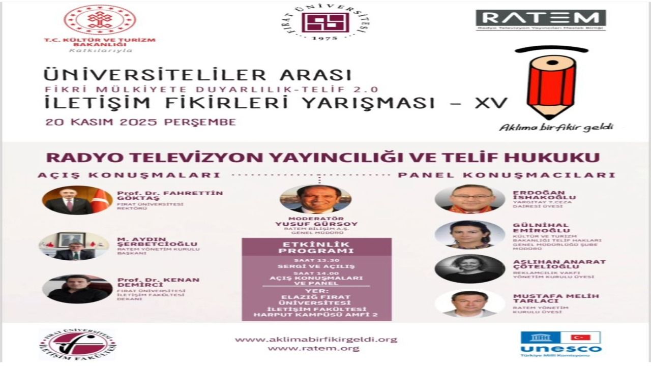 Radyo Televizyon Yayıncıları Meslek Birliği (RATEM) tarafından, Kültür ve Turizm Bakanlığı’nın katkılarıyla gerçekleştirilen “Aklıma Bir Fikir Geldi – Fikri Mülkiyete Duyarlılık Telif 2.0” temalı üniversiteler arası yarışmanın üniversiteler bölümü, 20 Kasım Perşembe günü Elazığ Fırat Üniversitesi’nde düzenlenecek.