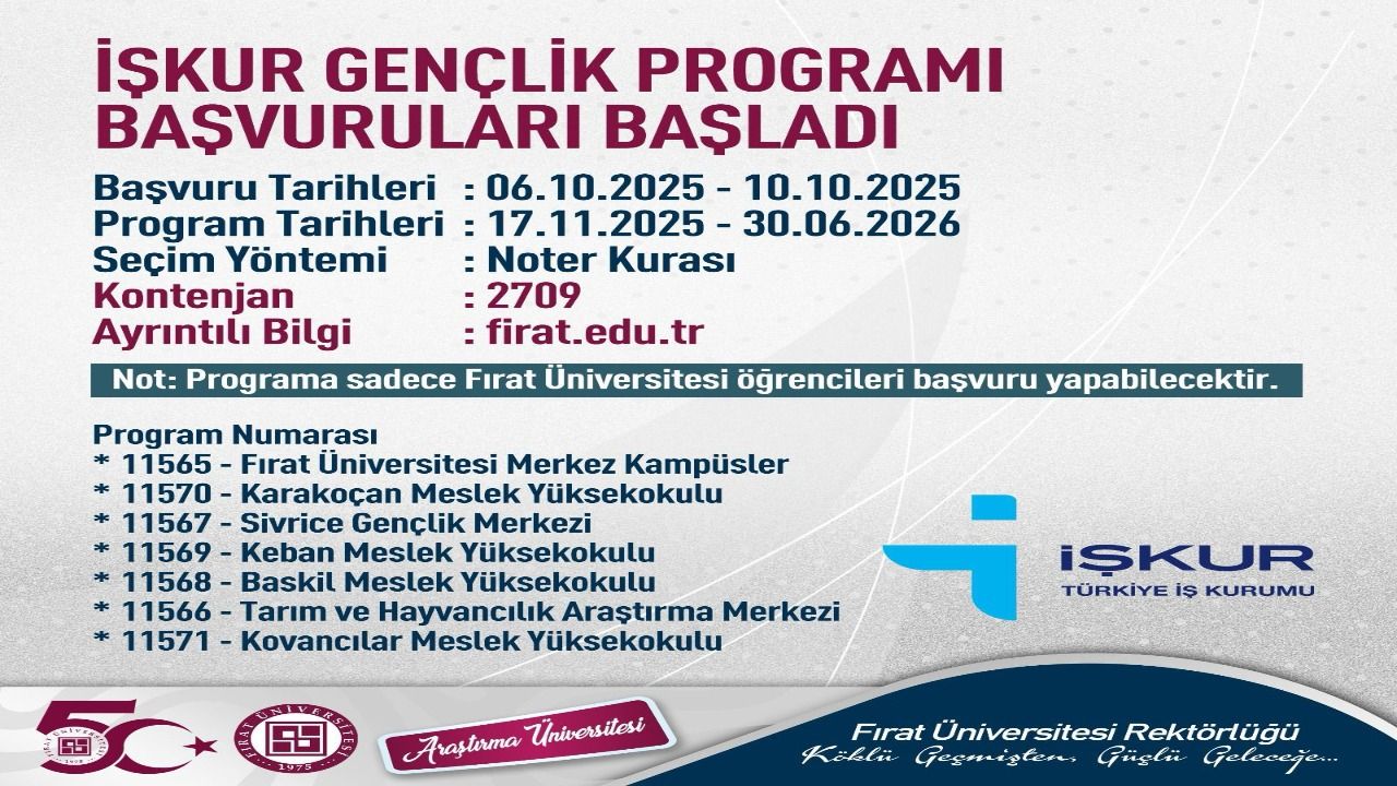 Fırat Üniversitesi öğrencilerine yönelik olarak düzenlenen İŞKUR Gençlik Programı, 2025–2026 dönemi başvurularını kabul etmeye başladı. Başvurular 6–10 Ekim 2025 tarihleri arasında yapılacak ve programa yalnızca Fırat Üniversitesi öğrencileri katılabilecek.