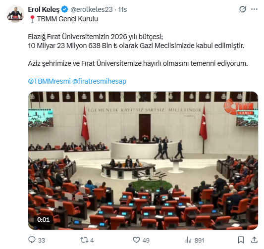 Türkiye Büyük Millet Meclisi Genel Kurulu’nda gerçekleştirilen görüşmeler sonucunda Fırat Üniversitesi’nin 2026 mali yılı bütçesi kabul edilerek yürürlüğe girdi. Kabul edilen bütçe ile üniversiteye toplam 10 milyar 23 milyon 638 bin TL kaynak tahsis edildi.