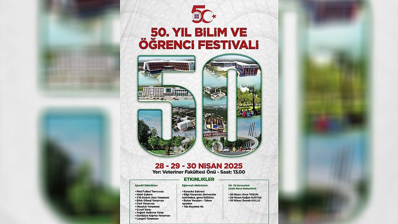 Fırat Üniversitesinin kuruluşunun 50. yılı dolayısıyla 50. yıl bilim ve öğrenci festivali 28 Nisan tarihinde başlıyor. 3 gün sürecek olan festival Veteriner Fakültesi önünde saat 13.00’da başlayacak. Festivalde, sportif yarışmalar, eğlenceli aktiviteler ve açık hava konserleri yer alacak. Ayrıca 60’ın üzerinde öğrenci topluluğu ile 10 kurum da stant açacak. Festival kapsamında mini futbol turnuvası, halat çekme, 3’lü basket atışı, bilek güreşi, dart, okçuluk, çuval yarışı, yoğurt yedirme, sandalye kapmaca ve langırt gibi çeşitli sportif yarışmalar düzenlenecek. Katılımcılar ayrıca karaoke sahnesinde yeteneklerini sergileyecek, bilgi yarışmalarında zekalarını yarıştırabilecek ve balon yarışları gibi takım oyunlarında eğlenceli anlar yaşayabilecek. Festivalde yüz boyama gibi renkli aktiviteler de yer alacak.