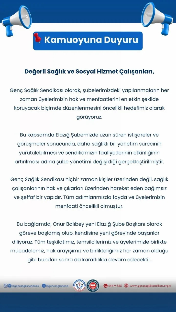 Genç Sağlık-Sen’den yapılan açıklamada, sendikanın temel önceliğinin her zaman sağlık ve sosyal hizmet çalışanlarının hak ve menfaatlerini en etkin şekilde korumak olduğu vurgulandı. Açıklamada, Elazığ Şubesi’nde uzun süren istişarelerin ardından daha verimli bir yönetim sürecinin yürütülmesi amacıyla değişiklik yapıldığı ifade edildi.