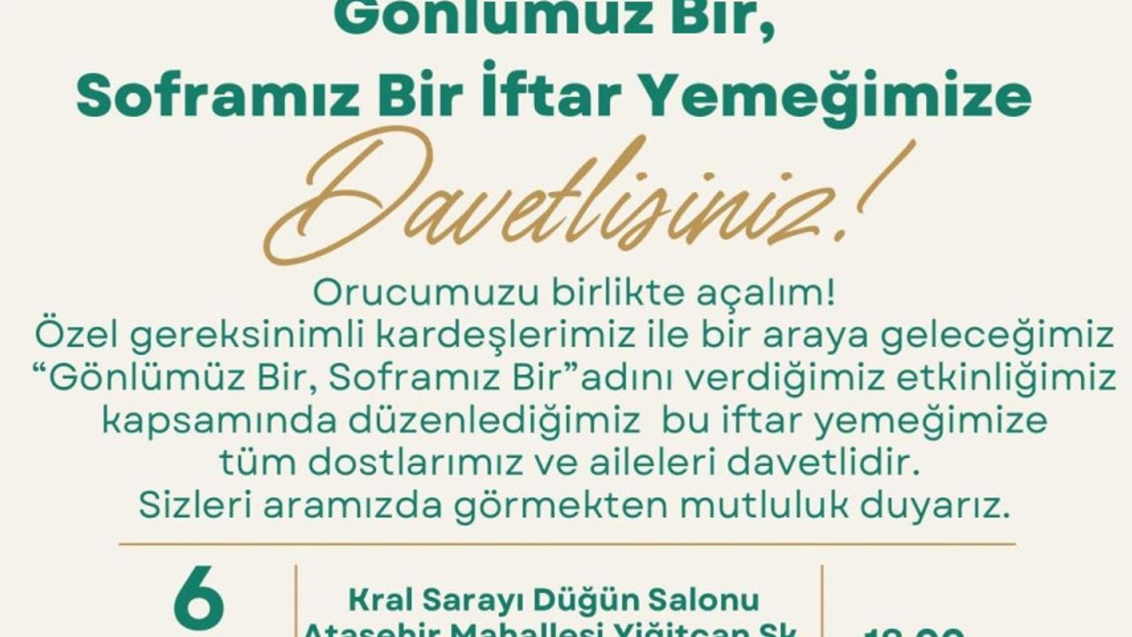 İyilik Çeşmesi Yardımlaşma Derneği, özel gereksinimli bireyler ve aileleriyle birlikte iftar sofrasında buluşmaya hazırlanıyor. “Gönlümüz Bir, Soframız Bir” adıyla düzenlenen etkinlik kapsamında, dayanışma ve kardeşlik duygularının pekişeceği bir iftar programı gerçekleştirilecek.