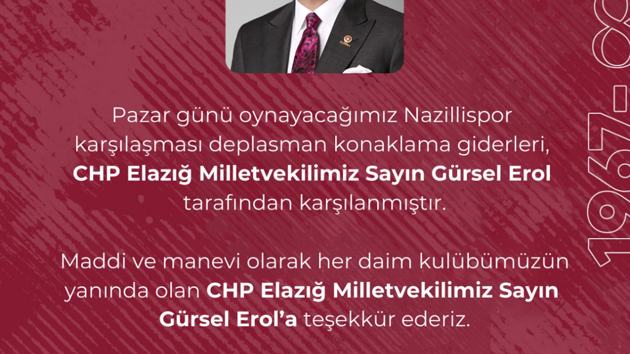 Cumhuriyet Halk Partisi (CHP) Elazığ Milletvekili Gürsel Erol, Elazığspor’un 2 Şubat Pazar günü deplasmanda Nazillispor ile oynayacağı karşılaşma öncesinde takıma destek sağladı. Erol, bordo-beyazlı ekibin deplasman konaklama giderlerini üstlenerek kulübe katkıda bulundu.