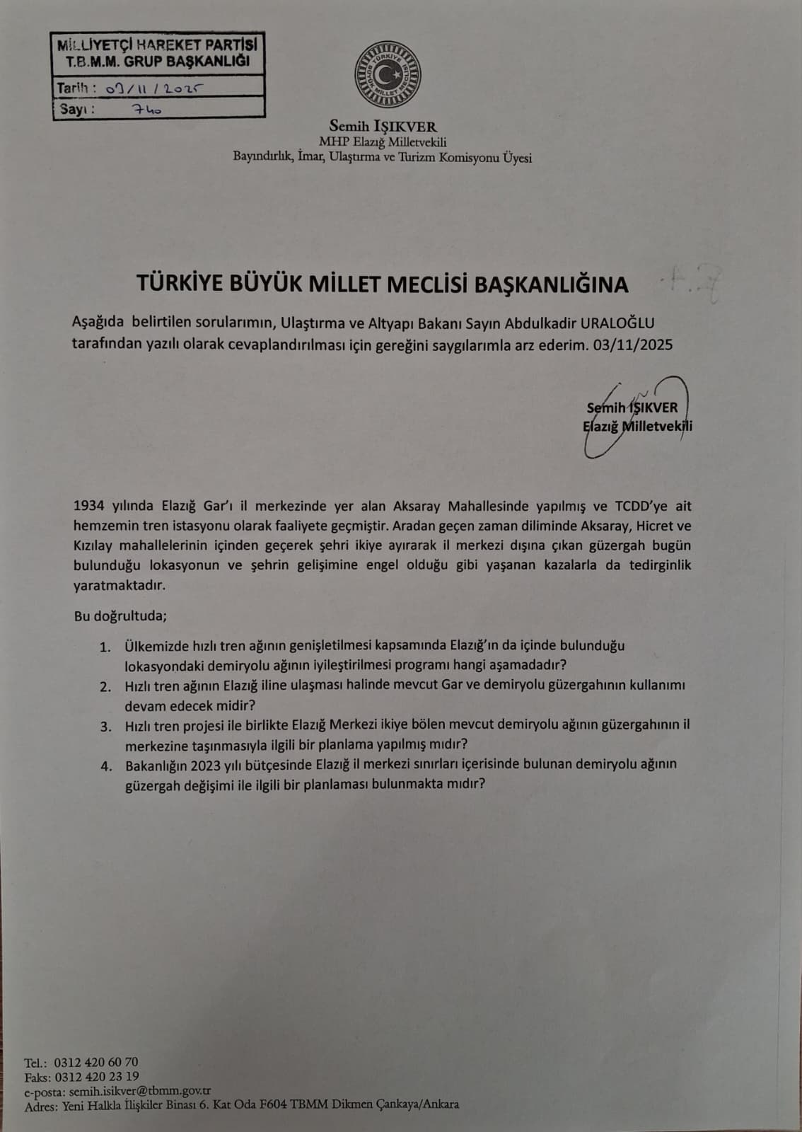 Işıkver Ulaştırma ve Altyapı Bakanı Abdulkadir Uraloğlu tarafından cevaplandırılması talebiyle TBMM’ye verdiği soru önergesinde şu ifadelerde bulundu: “1934 yılında Elazığ GAR’ı il merkezinde yer alan Aksaray Mahallesinde yapılmış ve TCDD’ye ait hemzemin tren istasyonu olarak faaliyete geçmiştir. Aradan geçen zaman diliminde Aksaray, Hicret ve Kızılay mahallelerinin içinden geçerek şehri ikiye ayırarak il merkezi dışına çıkan güzergah bugün bulunduğu lokasyonun ve şehrin gelişimine engel olduğu gibi yaşanan kazalarla da tedirginlik yaratmaktadır.