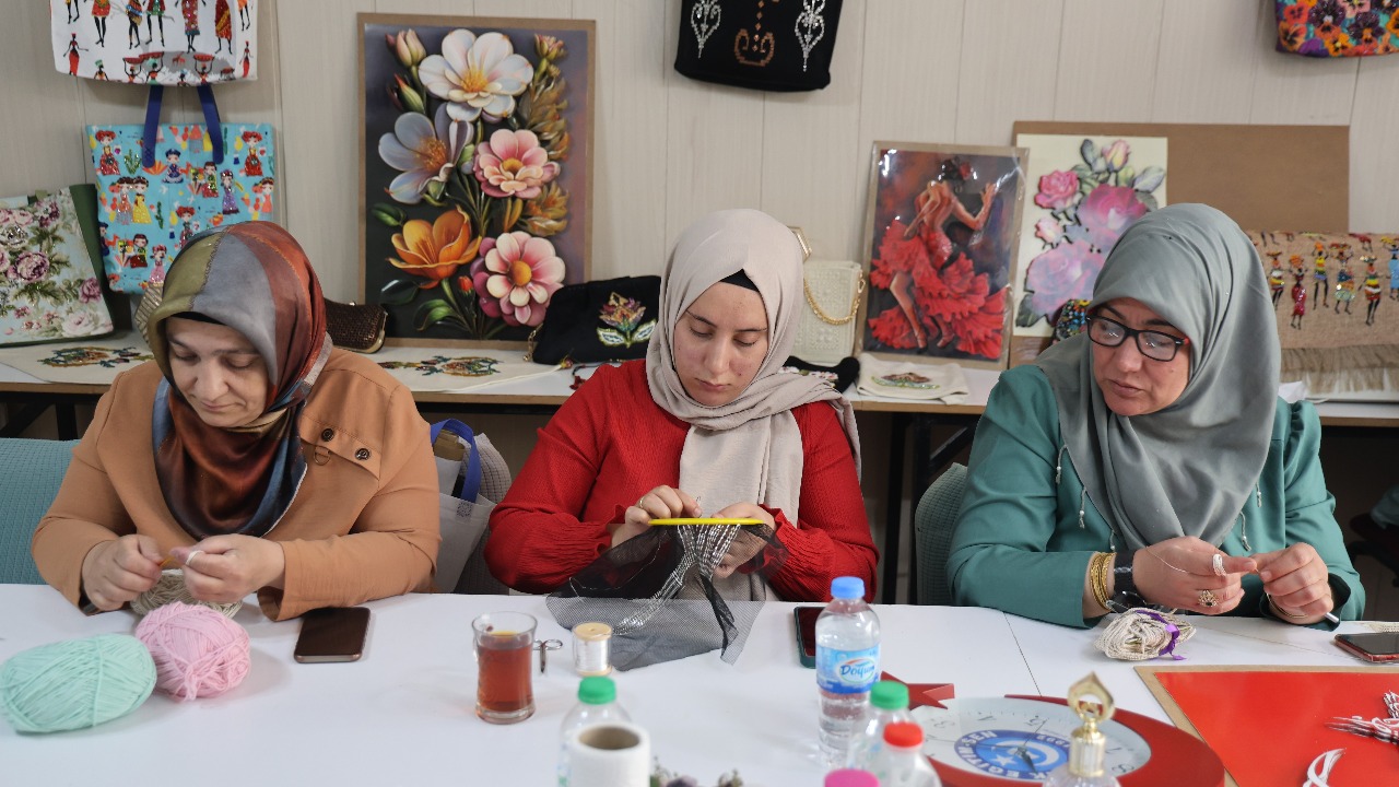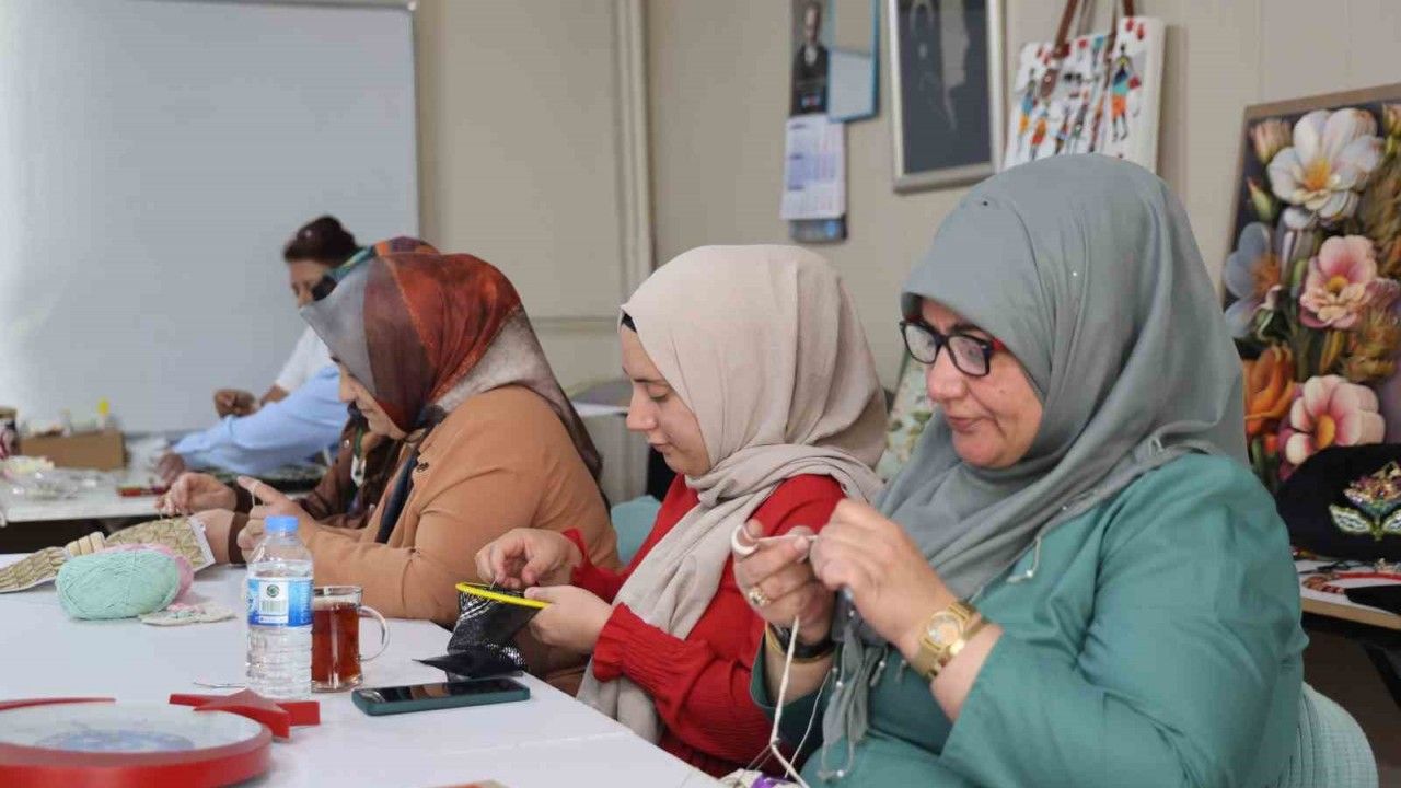 Elazığ’da kadınlar, Halk Eğitim Merkezi Müdürlüğü tarafından açılan El Sanatları Kursu’nda bir yandan sosyalleşirken bir yandan da öğreniyor.