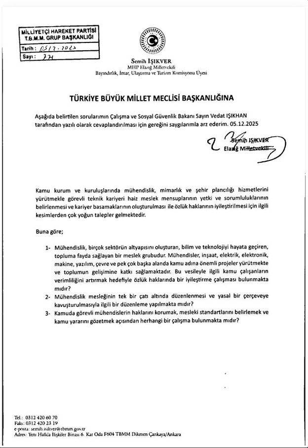 Milletvekili Işıkver’in sunduğu önergeyle, kamu mühendislerinin kariyer basamaklarının netleştirilmesi ve özlük haklarının günümüz koşullarına uygun şekilde yeniden ele alınması yönündeki beklentilerin Meclis çatısı altında değerlendirilmesi amaçlanıyor.