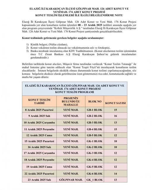 Konut teslimi için hak sahiplerinden nüfus cüzdanı, vekaleten işlem yapılacaksa vekaletnamenin aslı ve fotokopisi ile banka aracılığıyla düzenlenen KDV Taahhütnamesi istenecek. KDV taahhütnamesinin teslim öncesinde T.C. Ziraat Bankası Karakoçan Şubesi’nden alınması gerekiyor. Belgelerde eksiklik bulunması halinde işlemler yapılamayacağından, vatandaşların teslim gününde gerekli evraklarla hazır bulunması önem taşıyor.