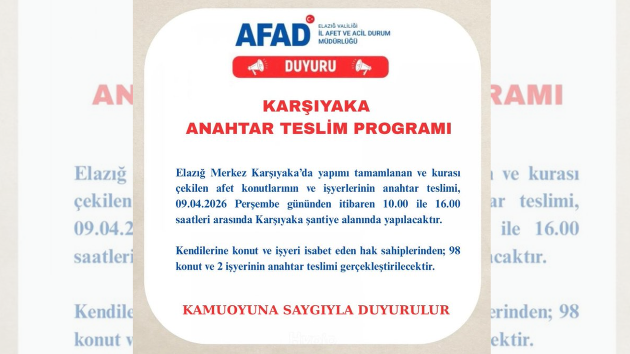 Elazığ İl Afet ve Acil Durum Müdürlüğü tarafından yapılan bilgilendirmede, Karşıyaka Mahallesi’nde inşası tamamlanan 98 konut ile 2 iş yerinin hak sahiplerine teslim edileceği bildirildi. Açıklamaya göre anahtar teslim işlemleri 9 Nisan Perşembe günü saat 10.00’da başlayacak.