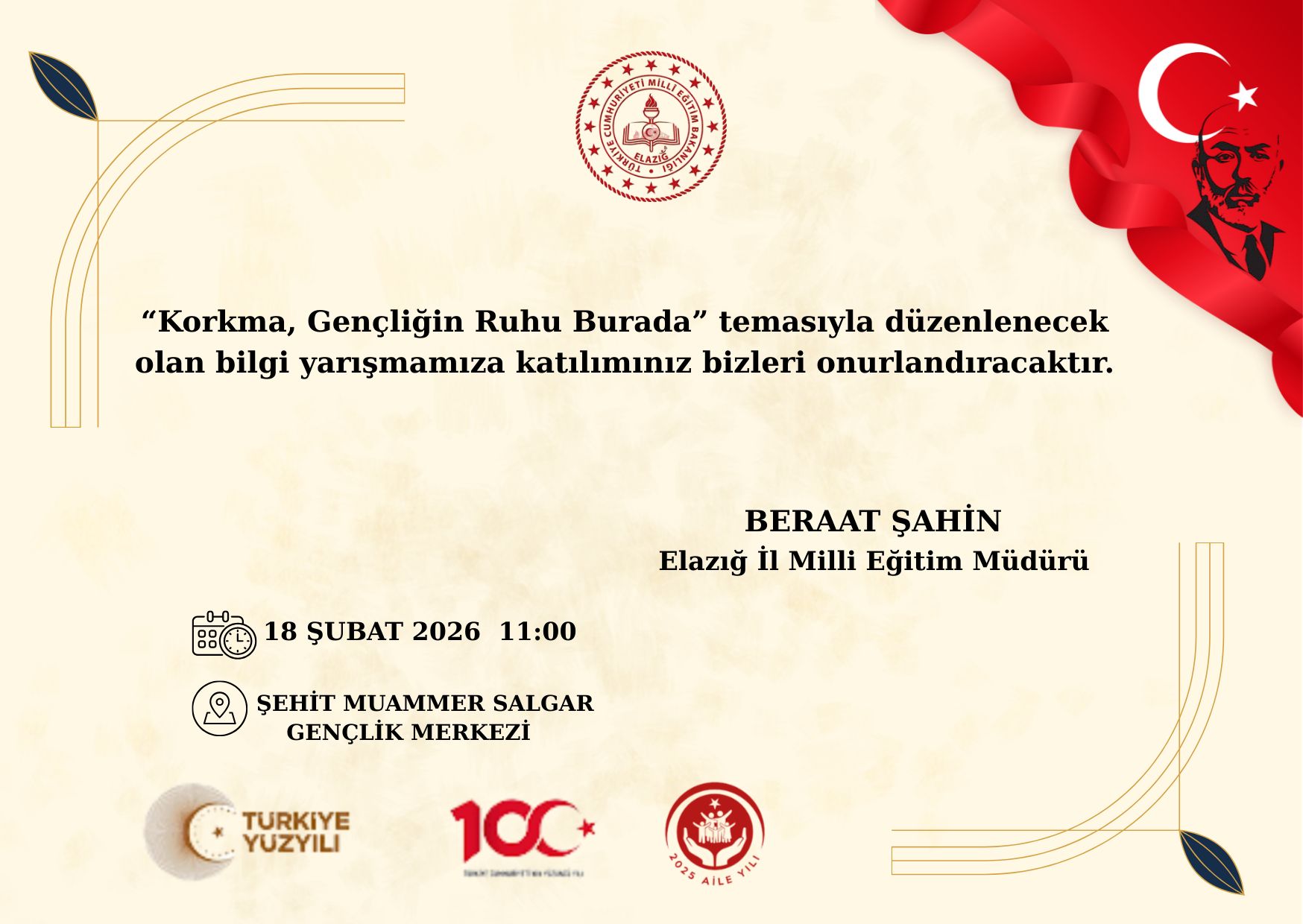 Öğrencilerin milli ve manevi değerlerle buluşmasını sağlamak, vatan şairi Mehmet Akif Ersoy’un düşünce dünyasını genç kuşaklara aktarmak ve İstiklâl Mücadelesi bilincini güçlendirmek amacıyla düzenlenen “Korkma, Gençliğin Ruhu Burada” temalı bilgi yarışmasının il finali tamamlandı. Final programına eğitim yöneticileri, öğretmenler ve öğrenciler katılım sağladı.