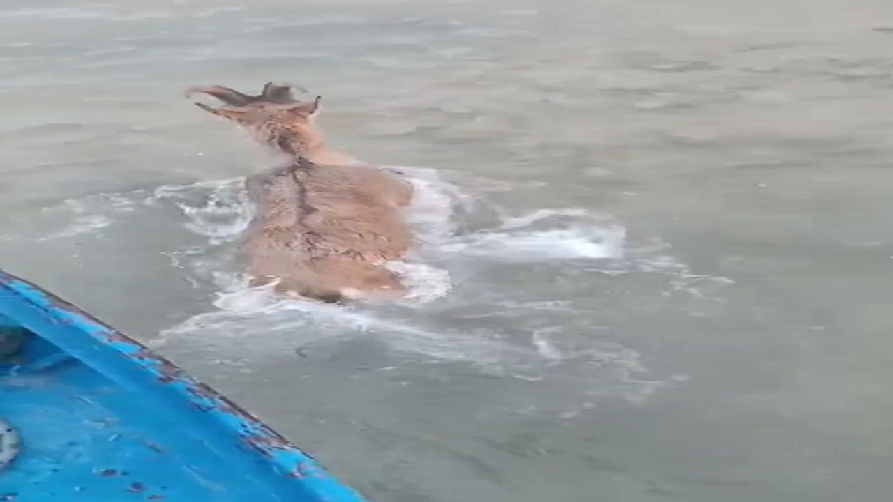 Elazığ’da kurtlardan kaçarken Keban Baraj Gölü’ne düşen dağ keçisini balıkçılar tekneyle kurtardı.