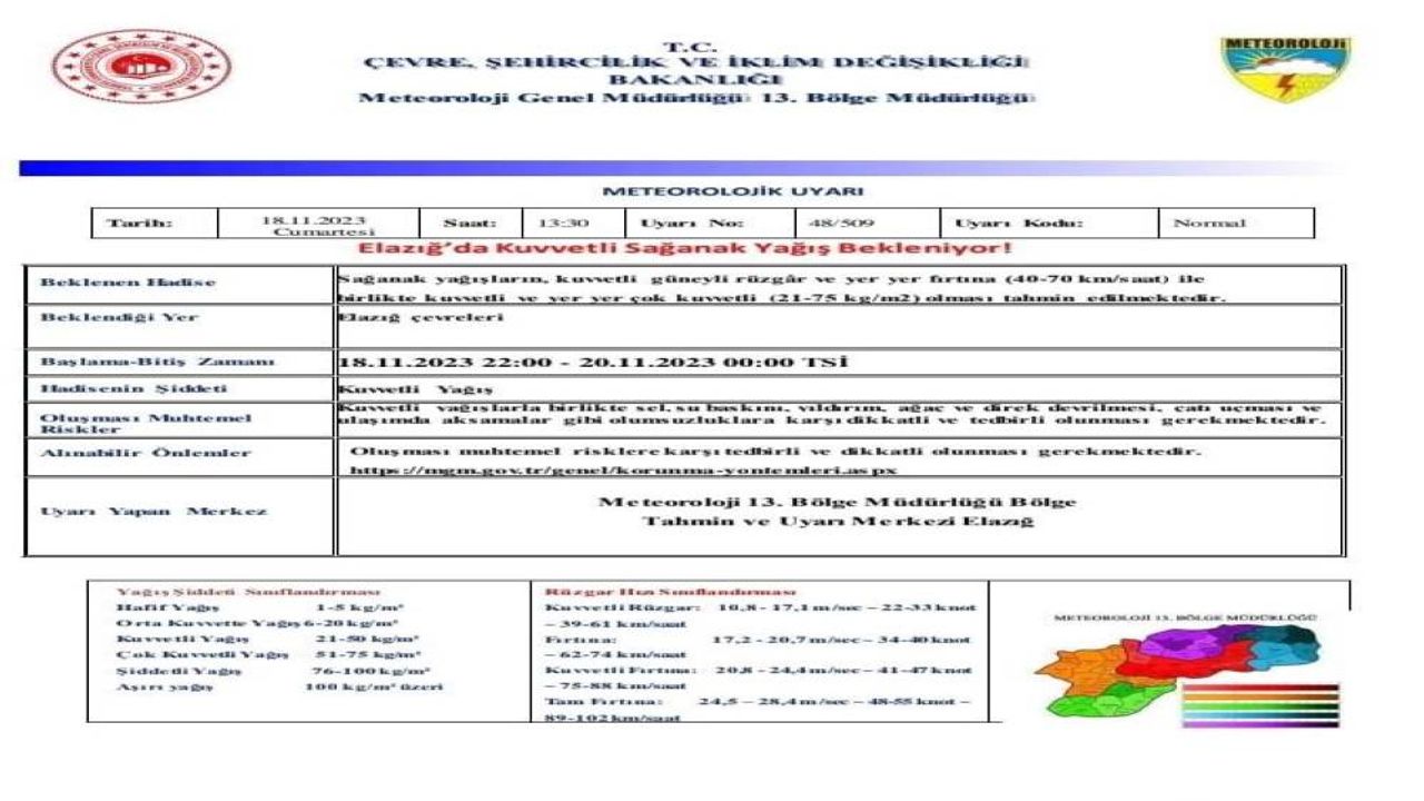 Meteoroloji 13. Bölge Müdürlüğü Bölge Uyarı ve Tahmin Merkezi, Elazığ ve çevresi ile Tunceli için sağanak yağış uyarısında bulundu. Açıklamada, kuvvetli yağışlarla birlikte sel, su baskını, yıldırım, ağaç ve direk devrilmesi, çatı uçması ve ulaşımda aksamalar gibi olumsuzluklara karşı vatandaşların dikkatli ve tedbirli olmaları istendi.