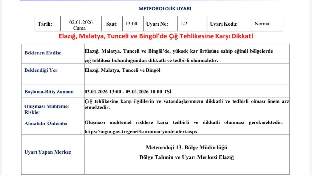 Hava sıcaklıklarında yaşanabilecek ani değişimler ile mevcut kar tabakasının yapısının, çığ oluşumunu tetikleyebileceği vurgulandı. Bu kapsamda, vatandaşların ve ilgili kurumların olası risklere karşı dikkatli ve tedbirli hareket etmesi gerektiği belirtildi.