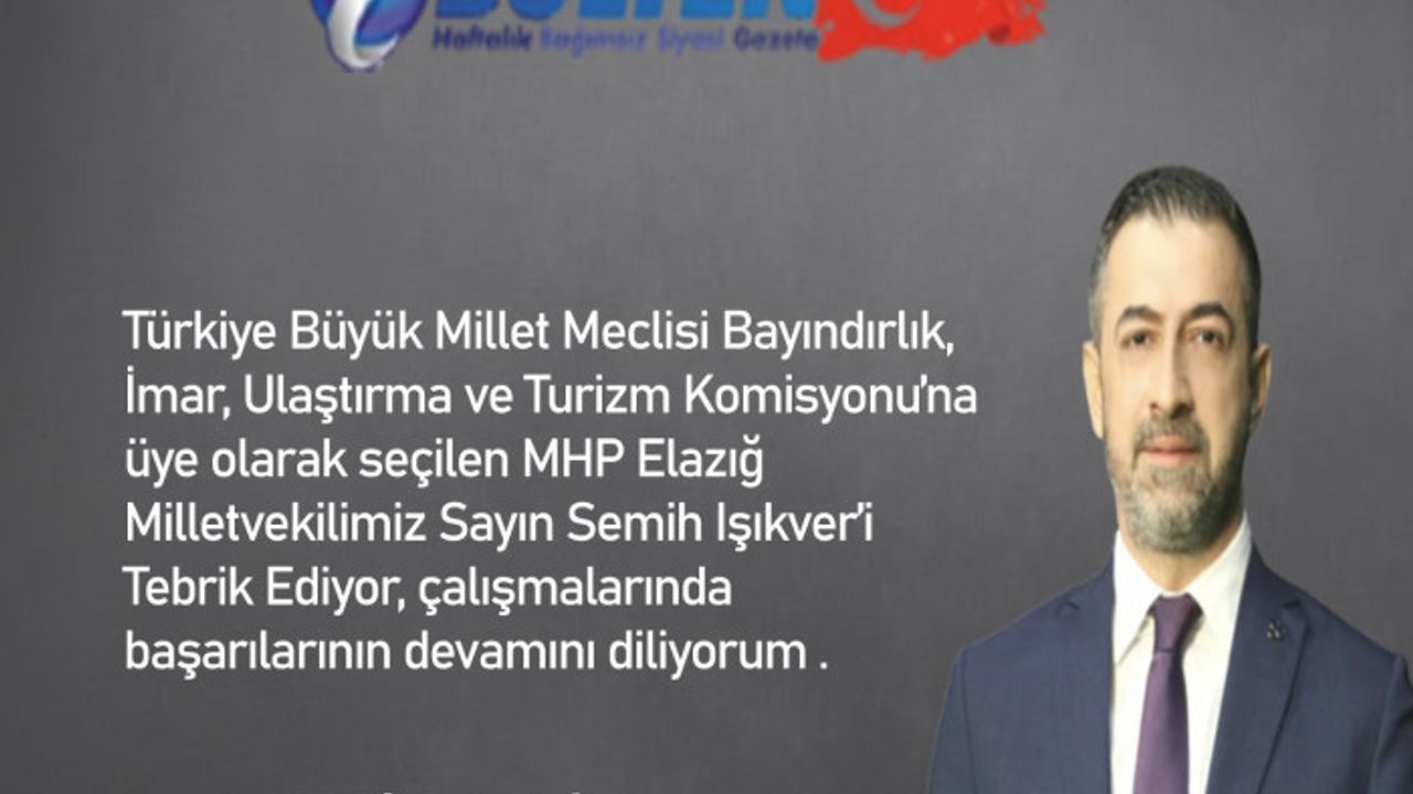 Elazığ Bülten Gazetesi olarak Milletvekili Semih Işıkver'i tebrik ediyoruz. Vekilimize başarılarının devamını diliyoruz.