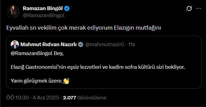 Nazırlı’nın daveti üzerine, Cumhurbaşkanlığı Tarım ve Gıda Politikaları Kurulu Üyesi ve TÜRES Genel Başkanı Ramazan Bingöl’ün Elazığ’a geleceği bildirildi. Bingöl’ün ziyareti kapsamında, Elazığ mutfağının yerel lezzetleri, sofra kültürü ve şehrin gastronomi potansiyelinin detaylı şekilde ele alınması bekleniyor.