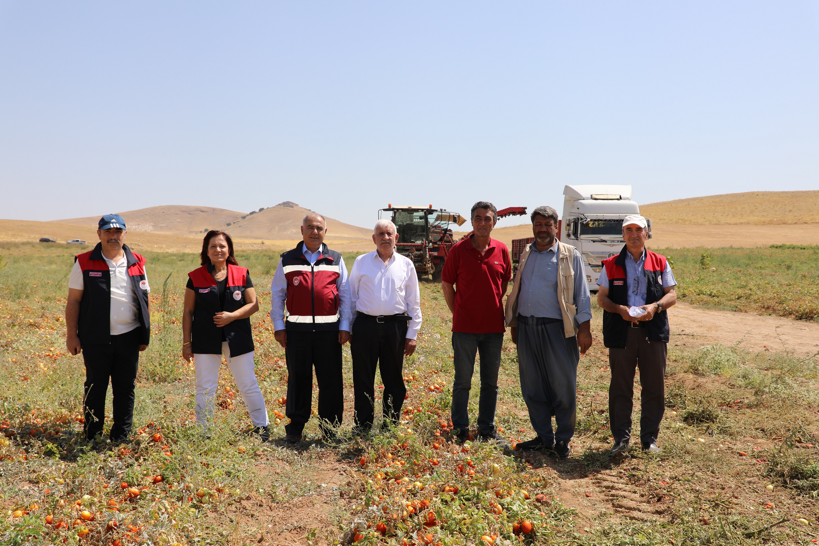 Elazığ İl Tarım ve Orman Müdürü Saadettin Taşkesen, teknik ekibiyle birlikte Alatarla Köyü’ndeki domates hasadını yerinde inceledi. Hasat makinesi ile yapılan çalışmalarda, bitkiler gövde hizasından kesilerek makineye alınıyor, domatesler ayrıştırılıyor ve taşıma bandı ile kamyon kasasına aktarılıyor.