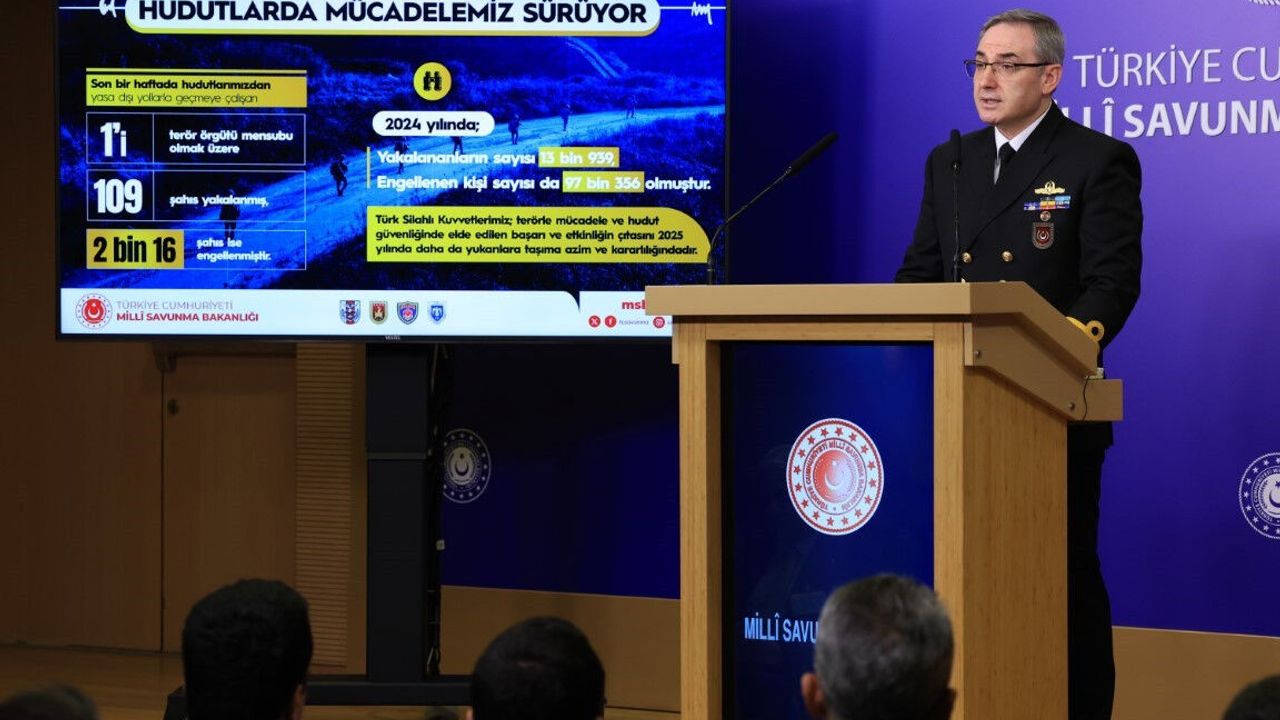 “Diğer taraftan terör yuvalarına kilit vurmaya devam eden Türk Silahlı Kuvvetlerimiz; geçtiğimiz hafta Pençe-Kilit Operasyonu bölgesinde teröristlere ait birçok bölümü bulunan mağara ile yine içerisinde çok sayıda silah, mühimmat ve yaşam malzemesi bulunan bir mağarayı tespit etmiştir.” Hudut hattında 1’i terörist toplamda 109 kişinin yakalandığını belirten Tuğamiral Aktürk, “2 bin 16 şahıs ise engellenmiştir. 7 gün 24 saat esasıyla çok yönlü ve etkin tedbirlerinin alındığı hudutlarımızdaki başarı rakamlara da yansımış; 2024 yılında hudutlarımızdan yasa dışı yollarla geçmeye çalışırken yakalananların sayısı 13 bin 939, engellenen kişi sayısı da 97 bin 356 olmuştur. Türk Silahlı Kuvvetlerimiz; terörle mücadele ve hudut güvenliğinde elde edilen başarı ve etkinliğin çıtasını 2025 yılında daha da yukarılara taşıma azim ve kararlılığındadır” şeklinde konuştu. Bölgesel ve küresel barış için öncü bir rol üstlenen TSK’nın birçok coğrafyada başarıyla görev yapmaya devam ettiğini hatırlatan Tuğamiral Aktürk, “13 yıllık iç savaşın ardından tarihî bir dönemden geçen komşumuz Suriye’de; mevcut durum ve gelişmeler yeni yönetim ile iş birliği ve koordinasyon içerisinde yakından takip edilmekte, Suriye’nin birliği ve toprak bütünlüğü ile terörle mücadeleye verdiğimiz önem ve öncelik kapsamında Suriye’nin güvenlik ve savunma kapasitesinin artırılmasına yönelik hazırlıklara devam edilmektedir. Birliklerimiz tarafından bölgede istikrarın sürdürülmesine yönelik gerekli tüm tedbirler alınmakta, Suriyelilerin gönüllü, güvenli ve saygın bir şekilde dönüşlerinin sağlanmasına yönelik çalışmalar sürdürülmektedir” diye konuştu.