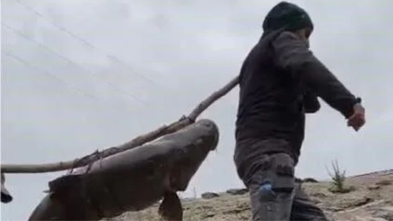 Elazığ’da amatör balıkçılar, Murat Nehri’nde at-çek yöntemiyle 60 kiloluk dev bir turna balığı yakaladı. Yakaladığı dev turnayı kıyıya çıkaran balıkçılar, 60 kiloluk dev turna balığını taşıyamayınca çam sırığına bağladıktan sonra omuzlarda taşıdılar. 2 balıkçı yakalanan dev turna balığını taşımak için zorlanırken, o anlar cep telefonu ile kayıt edildi.