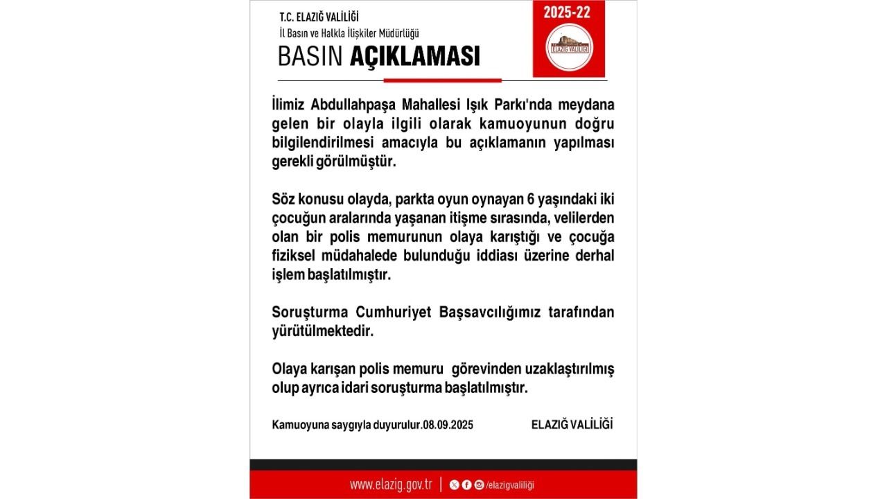 Elazığ Valiliğinden yapılan açıklamada, "İlimiz Abdullahpaşa Mahallesi Işık Parkı’nda meydana gelen bir olayla ilgili olarak kamuoyunun doğru bilgilendirilmesi amacıyla bu açıklamanın yapılması gerekli görülmüştür. Söz konusu olayda, parkta oyun oynayan 6 yaşındaki iki çocuğun aralarında yaşanan itişme sırasında, velilerden olan bir polis memurunun olaya karıştığı ve çocuğa fiziksel müdahalede bulunduğu iddiası üzerine derhal işlem başlatılmıştır. Soruşturma Cumhuriyet Başsavcılığımız tarafından yürütülmektedir. Olaya karışan polis memuru görevinden uzaklaştırılmış olup ayrıca idari soruşturma başlatılmıştır" denildi.