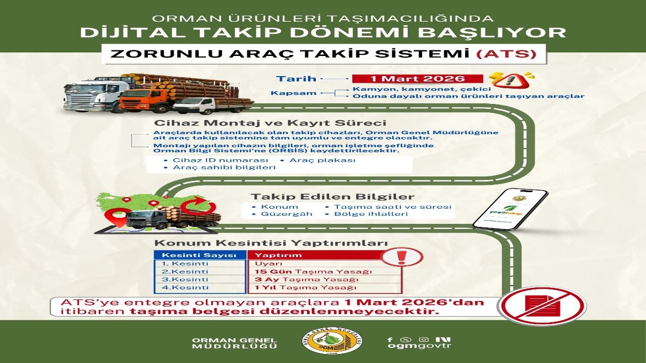 Orman Genel Müdürlüğü tarafından orman ürünleri taşımacılığında denetim ve izlenebilirliği artırmak amacıyla Zorunlu Araç Takip Sistemi (ATS) uygulamasına geçiliyor. 1 Mart 2026 tarihi itibarıyla yürürlüğe girecek sistem kapsamında, oduna dayalı orman ürünlerini taşıyan kamyon, kamyonet ve çekiciler dijital olarak izlenecek.