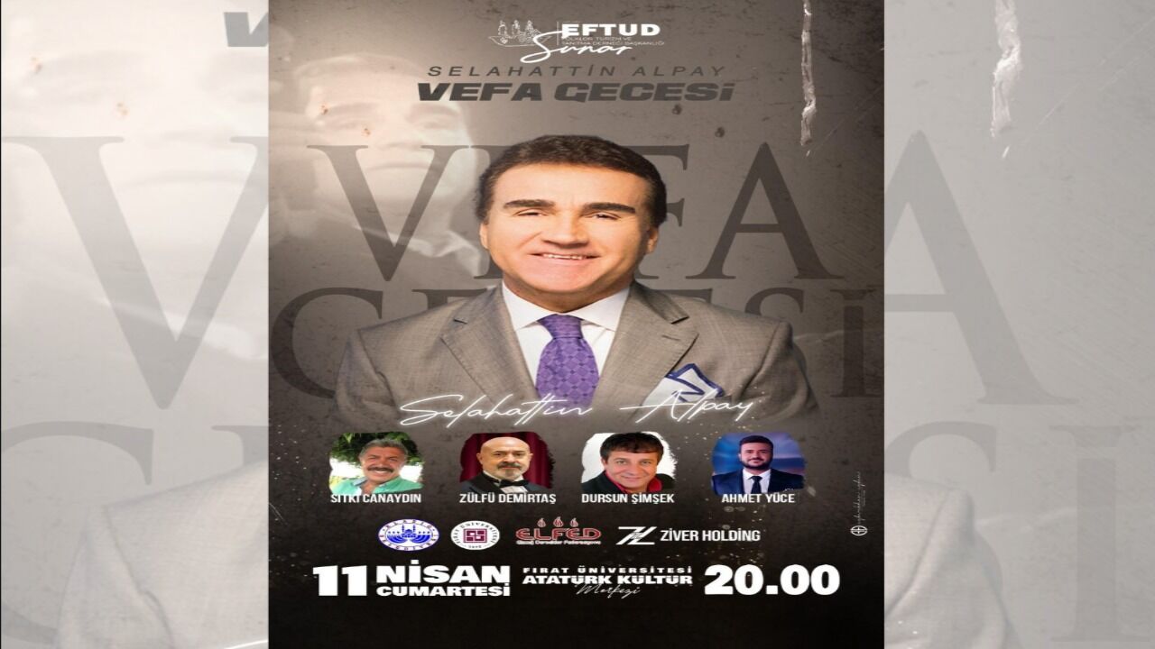 11 Nisan Cumartesi günü saat 20.00’de Fırat Üniversitesi Atatürk Kültür Merkezi’nde gerçekleştirilecek etkinlikte, alanında tanınmış sanatçılar sahne alacak. Program kapsamında Sıtkı Canaydın, Zülfü Demirtaş, Dursun Şimşek ve Ahmet Yüce, Selahattin Alpay’ın sevilen eserlerini seslendirecek.