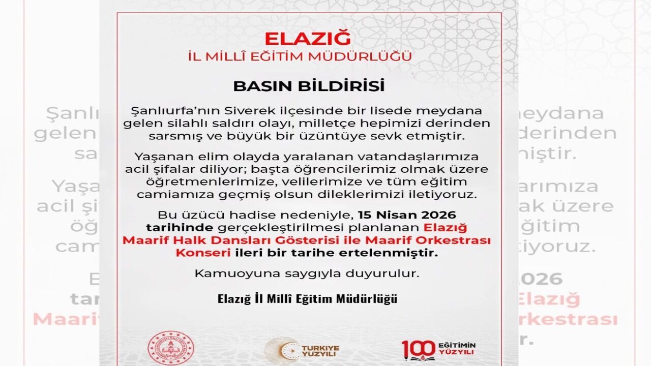 Bu kapsamda, 15 Nisan 2026 tarihinde gerçekleştirilmesi planlanan Elazığ Maarif Halk Dansları Gösterisi ile Maarif Orkestrası Konseri’nin ileri bir tarihe ertelendiği bildirildi. Etkinliklerin yeni tarihine ilişkin bilgilendirmenin ilerleyen günlerde yapılacağı kaydedildi.