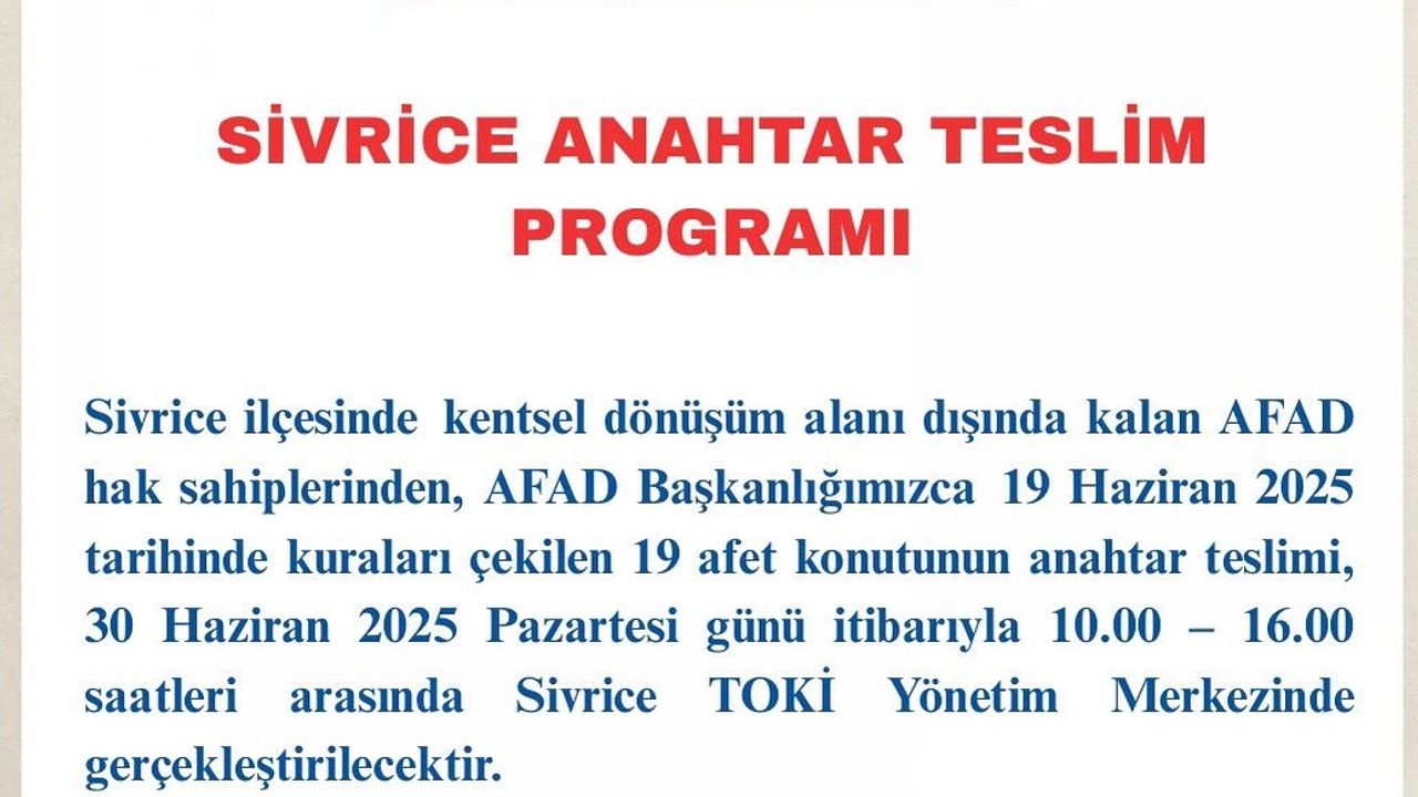 “Sivrice ilçesinde kentsel dönüşüm alanı dışında kalan AFAD hak sahiplerinden, AFAD Başkanlığımızca 19 Haziran 2025 tarihinde kuraları çekilen 19 afet konutunun anahtar teslimi, 30 Haziran 2025 Pazartesi günü itibarıyla 10.00 - 16.00 saatleri arasında Sivrice TOKİ Yönetim Merkezinde gerçekleştirilecektir.”