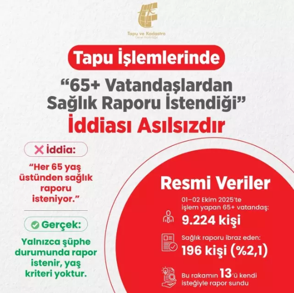 Kurumun verilerine göre 1-2 Ekim tarihlerinde Türkiye genelinde tapu işlemi gerçekleştiren 65 yaş üstü vatandaş sayısı 9 bin 224 oldu. Bu işlemlerden yalnızca 196’sında sağlık raporu talep edildiği kaydedildi. Böylelikle rapor talebinin yaygın ve rutin bir uygulama olmadığı, yalnızca istisnai durumlarda başvurulduğu istatistiklerle ortaya konuldu.