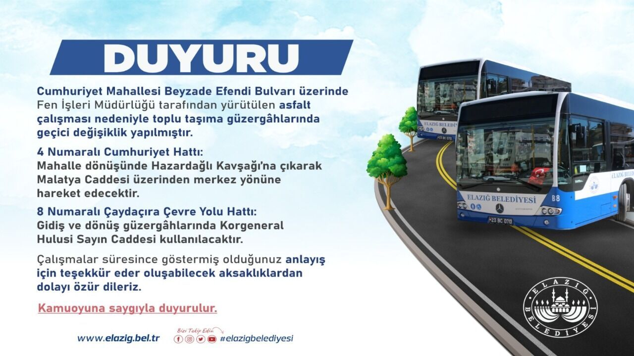 Elazığ Belediyesi tarafından yapılan açıklamada, Cumhuriyet Mahallesi Beyzade Efendi Bulvarı’nda gerçekleştirilen yol yenileme çalışmalarından dolayı bazı toplu taşıma güzergahlarında çalışmalar tamamlanıncaya kadar geçici bir değişiklik yapıldığı duyuruldu.
