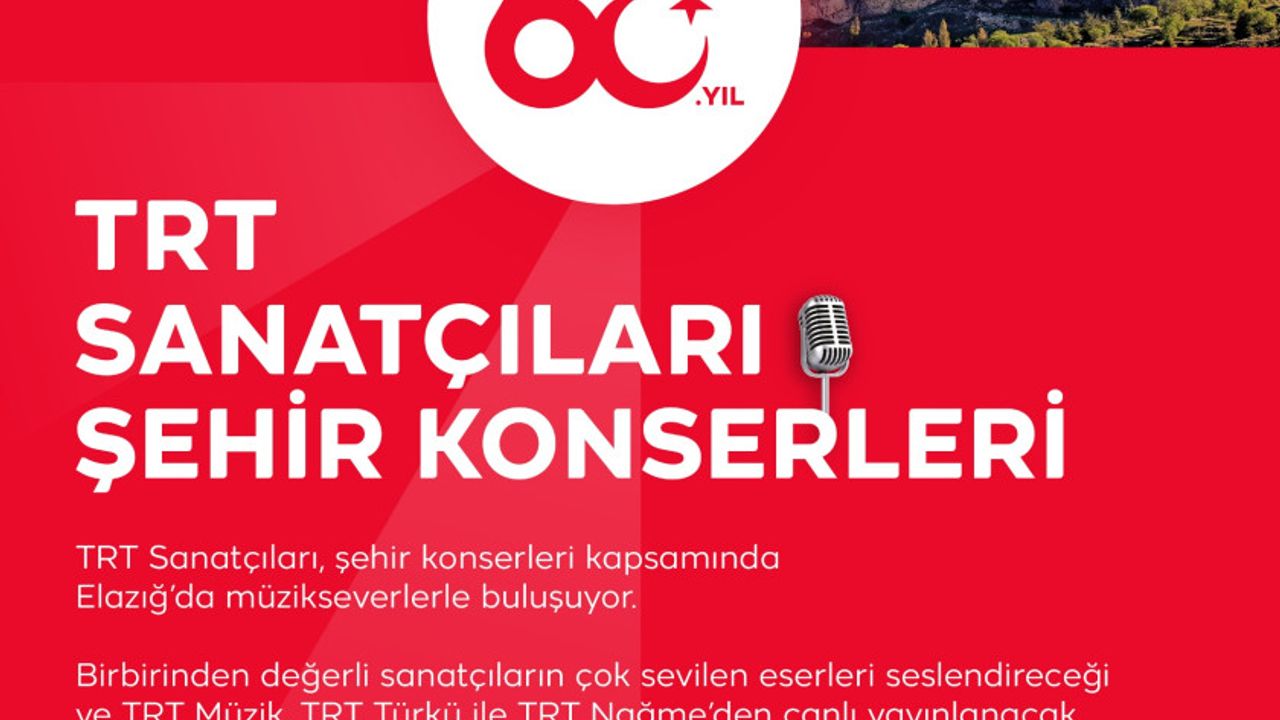 TRT’nin 60. yıl kutlamaları kapsamında düzenlenen "TRT Sanatçıları Şehir Konserleri" serisinin yeni durağı Elazığ olacak. Türk Halk Müziği ve Türk Sanat Müziği sanatçılarının sahne alacağı konser, 21 Kasım Perşembe günü Ahmet Tevfik Ozan Fuar ve Kongre Merkezi’nde gerçekleşecek. Etkinlik, TRT Müzik Kanalı, TRT Türkü ve TRT Nağme radyolarından canlı olarak yayınlanacak.
